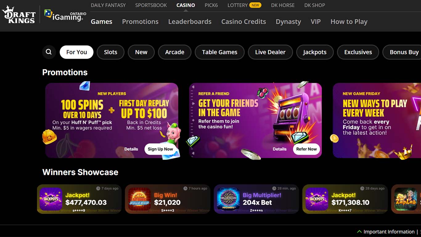 DraftKings Ontario holds a valid, verifiable licence from the Alcohol and Gaming Commission of Ontario (AGCO). We found thousands of casino games on their website, including slots, live dealer games, and table games. Here’s a quick overview of DraftKings casino: