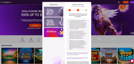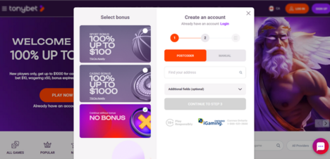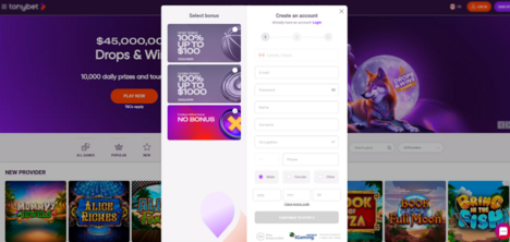 During our testing of this casino, the first thing we realized was the easy registration phase. It only takes about a minute to create an account and start playing games there. If you are ready to get started at TonyBet, follow these steps for a quick and easy sign-up: